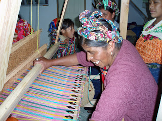 Although most of us know how to weave on the backstrap loom, the first thing we did was learn to weave on the foot loom. We shared one loom while we were learning. In fact, we learned so well we were able to use our very first fabric in the very first product we sold --these pink cosmetics bags. Then we added three looms, and later another two. So, today we have six looms. Five of us weave full time, taking turns on each of the looms. We like to learn new designs, and have learned some more complicated designs using 4 pedals. Some of the fabrics we weave are simple, while others are more complicated, so it is nice to have the chance to take turns working on each of the different fabrics. The sixth loom is shared by three of the backstrap loom weavers who recently learned to weave on the foot looms and now split their time between weaving with the backstrap and weaving on the foot loom.